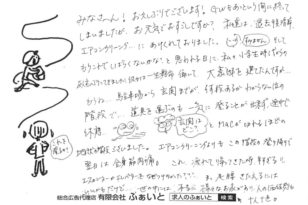 みなさ~~ん!!お久しぶりでございます!!GWもあっという間に終わって しまいましたが、お元気でおすごしですか?私達は退去後清掃、 エアコンクリーニングに明け暮れておりました。すみません… そして、もうこれでしばらくないかな?と思われる日に私の小学生時代 からの友人宅へ行ってきました!!彼女は一生懸命働いて大豪邸を建てたん ですが…もうね…駐車場から玄関までが何段あるかわからない位の階段で… 道具を運ぶのも一気に登ることが出来ず途中で休憩… 「玄関どこ??」Macが切れるほどの地獄の階段でございました。 エアコンクリーニングよりも、この階段の登り降りで翌日は全身筋肉痛… これ疲れて帰ってきた時辛すぎる!!エスカレータかエレベーターをなぜ つけなかった??まっ足腰を鍛えるにはいいかもだけど…。世の中には 本当に様々なお家があり人の価値観も十人十色♥