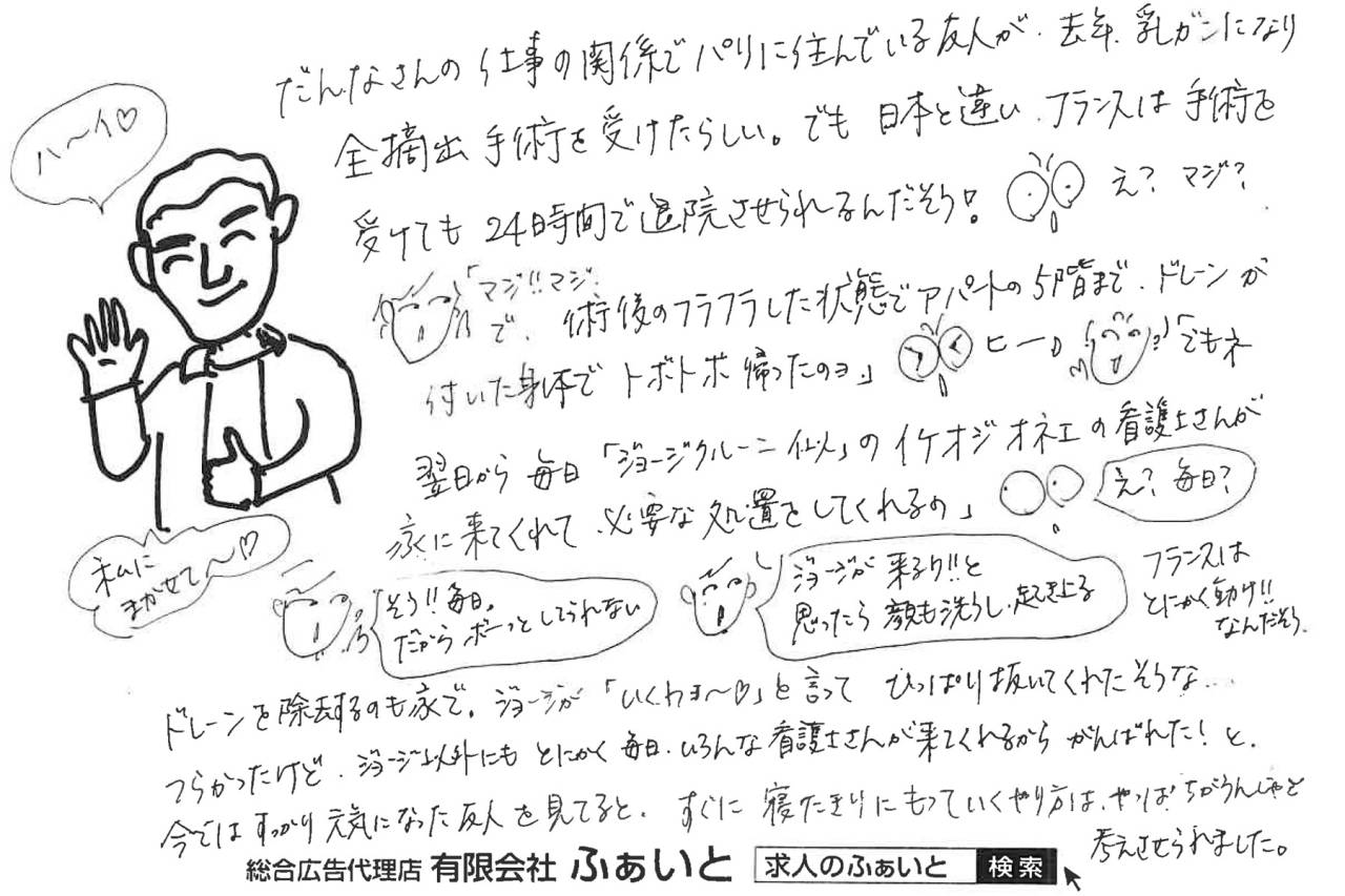 だんなさんの仕事の関係でパリに住んでいる友人が去年 乳ガンになり全摘出手術を受けたらしい。でも日本と違い フランスは手術を受けても24時間で退院させられるそうだ! えっ?マジ? 「マジ!!マジで術後のフラフラした状態でアパートの5階まで ドレーンが付いた身体でトボトボ帰ったヨ」ヒーーー!? 「でもネ、翌日から毎日ジョージ・クルーニー似のイケオジオネエの 看護士さんが家に来てくれて必要な処置をしてくれるの」えっ?毎日? 「そう!!毎日!!だからボーっとしてられない」 「ジョージが来るワ!!と思ったら顔も洗うし、起き上がる」 フランスはとくかく動け!!なんだそう ドレーンを除去するのも家で、ジョージが「いくわヨ~・」って言って ひっぱり抜いてくれたそうな・・・。辛かったけどジョージ以外にも とにかく毎日いろんな看護士さんが来てくれるから、がんばれた!!と 今では、すっかり元気になった友人を見てると、すぐに寝たきりに もっていくやり方は、やっぱり違うんじゃと考えさせられました。